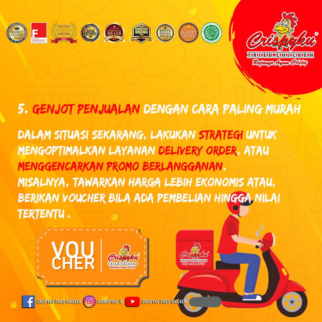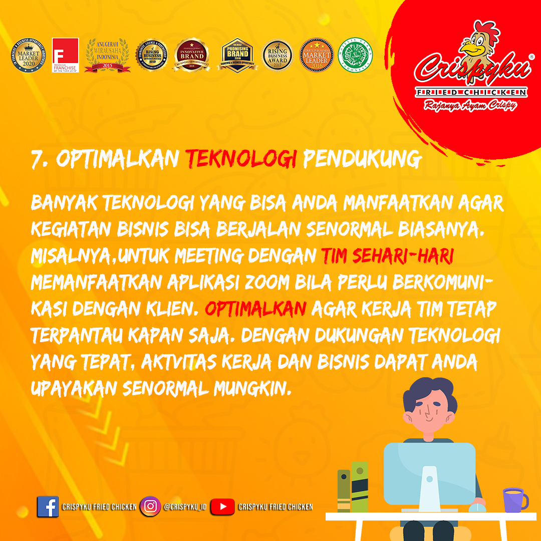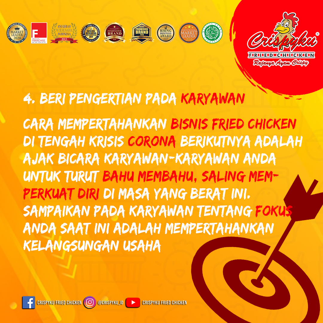Wabah penyakit virus corona (COVID-19) yang melanda dunia sejak awal tahun telah mengguncang kehidupan masyarakat sehari-hari. Hingga tercatat sebanyak 724.565 kasus COVID-19 dengan korban meninggal dunia mencapai 34.107 orang di 199 negara di dunia. Di Indonesia, COVID-19 telah menginfeksi sebanyak 1.414 orang di mana sebanyak 122 orang meninggal dunia akibat penyakit menular itu. Bukan hanya mengancam nyawa saja , wabah virus corona juga telah memukul banyak kelangsungan Usaha Waralaba. Lalu, bagaimana cara untuk mempertahankan Bisnis Fried Chicken di tengah krisis corona.