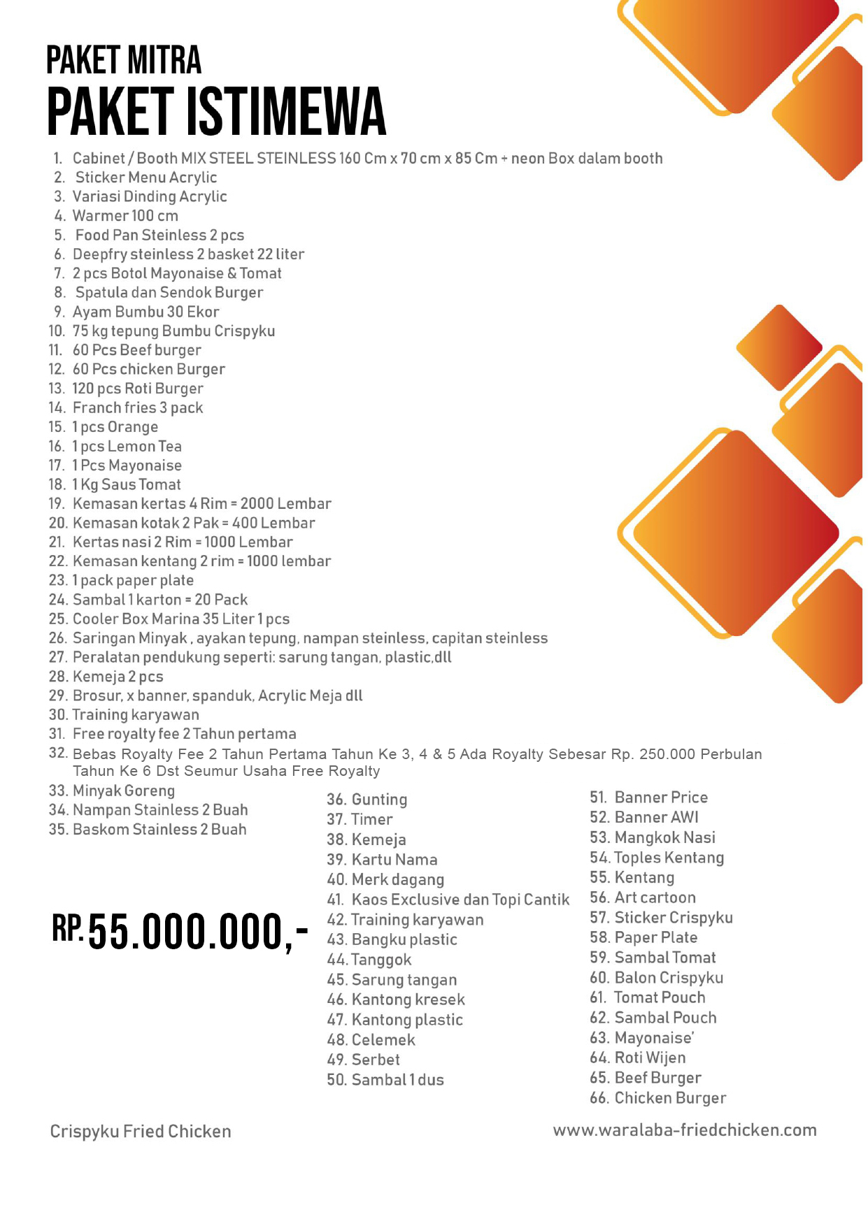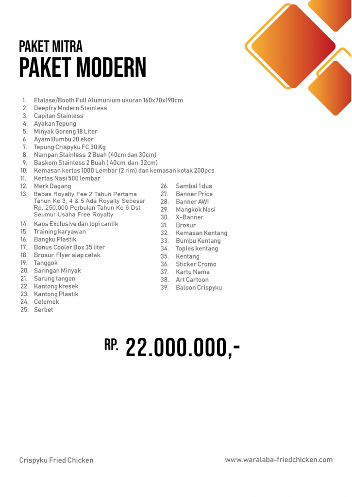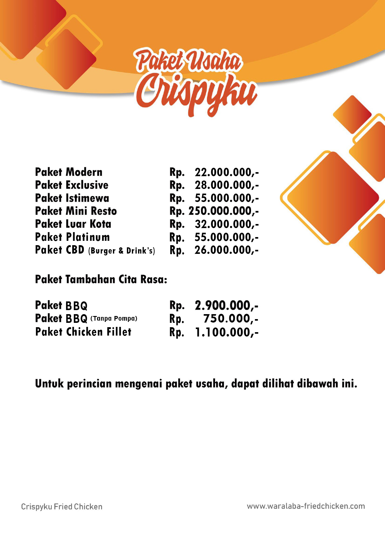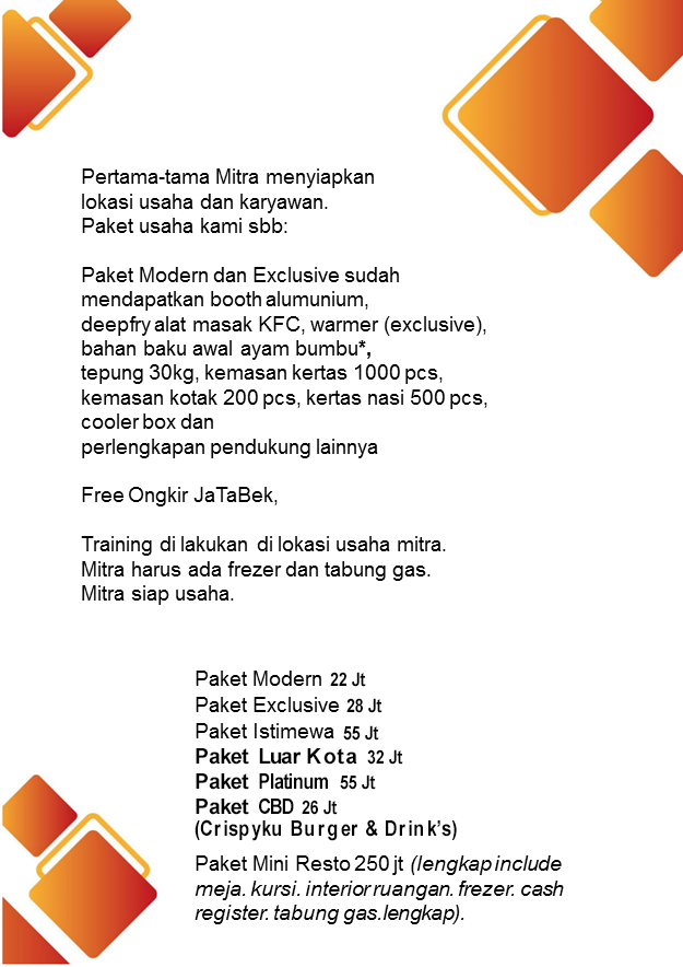 Apabila Anda tertarik dengan Bisnis Usaha Waralaba CBD (Crispyku Burger & Drink’s) atau Crispyku Fried Chicken silahkan hubungi no 0815 9979282 atau kunjungi website resmi kami di www.waralaba-friedchicken.com / www.crispyku.com
