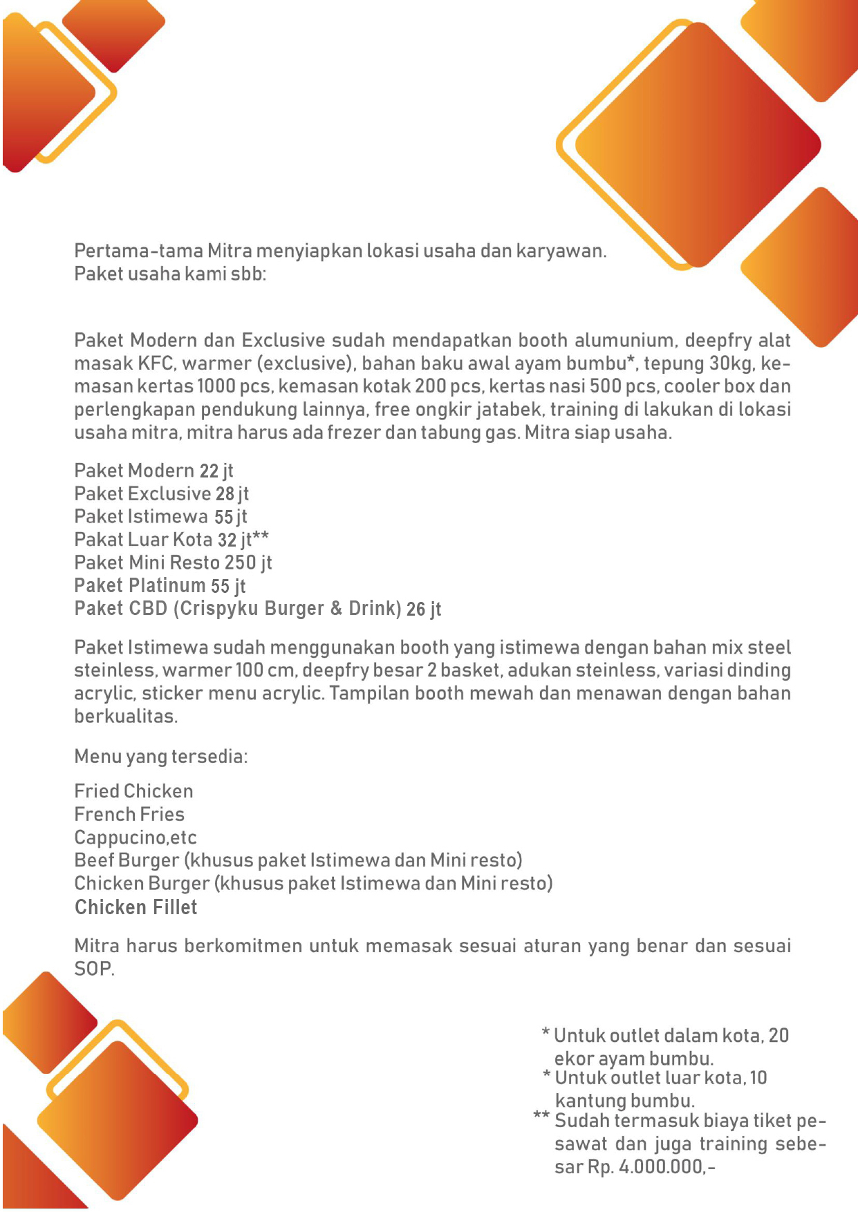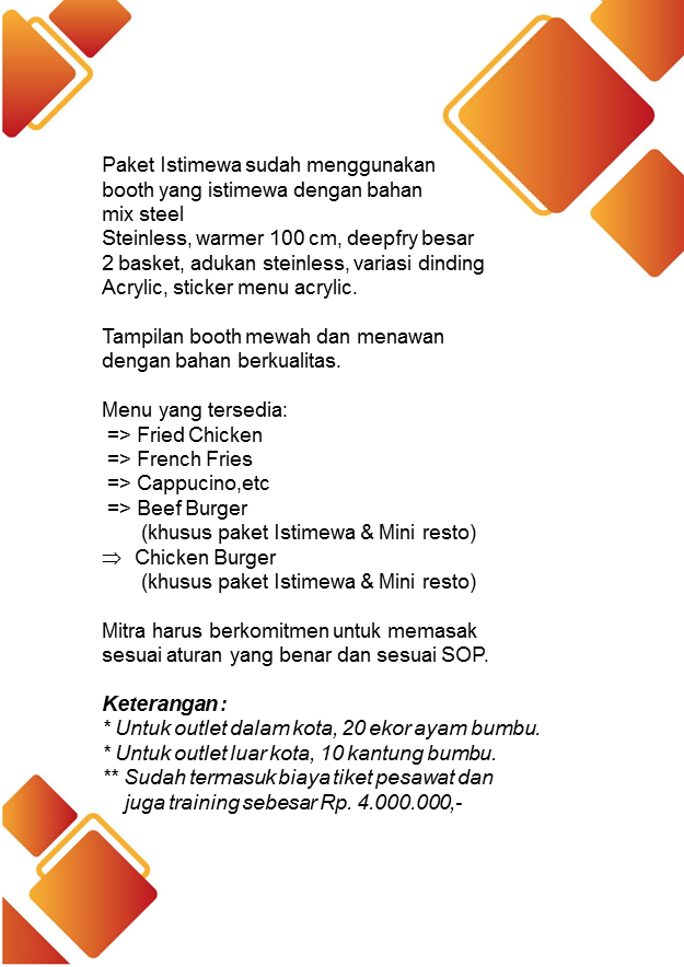 Dalam dunia Usaha Waralaba Fried Chicken , menjadi salah satu bidang yang banyak digeluti oleh para pebisnis. Cenderung lebih mudah untuk dijalankan, bahkan dengan modal rendah Anda sudah bisa menjalankan Waralaba Fried Chicken ini. Selain itu, Usaha Waralaba Fried Chicken yang berkaitan dengan makanan merupakan kebutuhan utama manusia menjadikannya Peluang Usaha Waralaba Fried Chicken yang banyak di incar. Segmen pasarnya pun beragam dengan cakupannya yang sangat luas, mulai dari anak-anak sampai dengan orang dewasa.