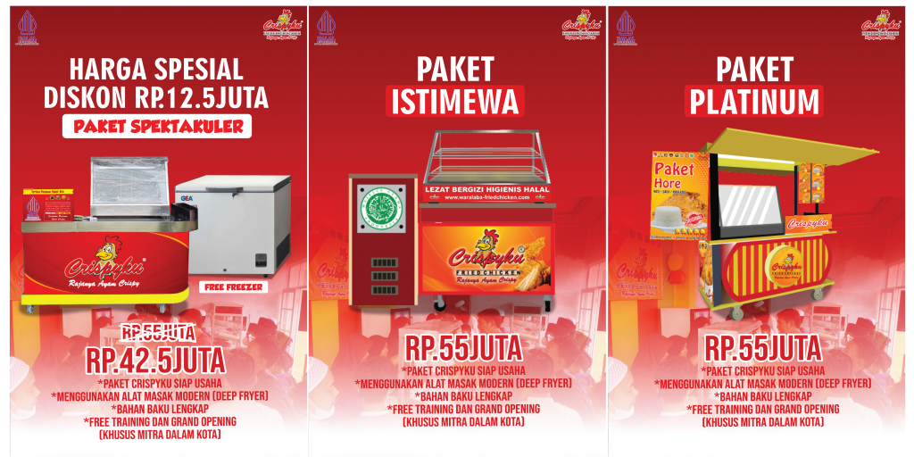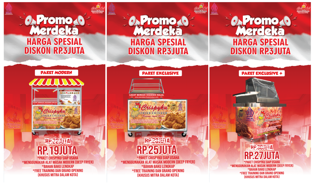 Di momen spesial ini memperingati hari kemerdekaan Indonesia 2024, Crispyku Fried Chicken memberikan tawaran luar biasa untuk memulai perjalanan bisnis kamu! Ayo raih kebebasan finansial dengan bergabung bersama kami dengan berbagai paket Franchise spesial Promo Merdeka. Kami mempersembahkan berbagai promo paket franchise dengan diskon fantastis yang dirancang khusus untuk memudahkan kamu memulai usaha lengkap dengan bahan baku dan alat masak.