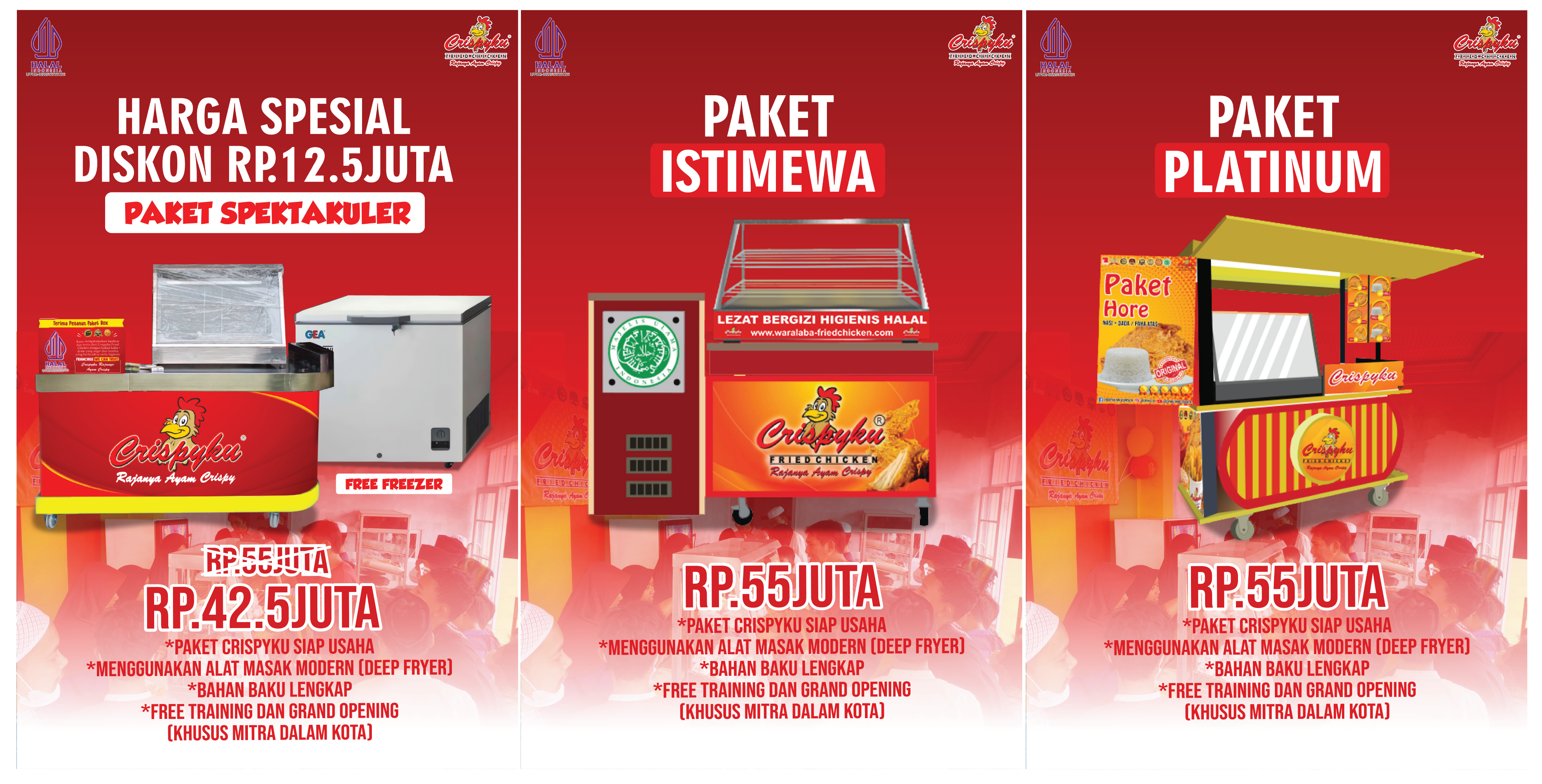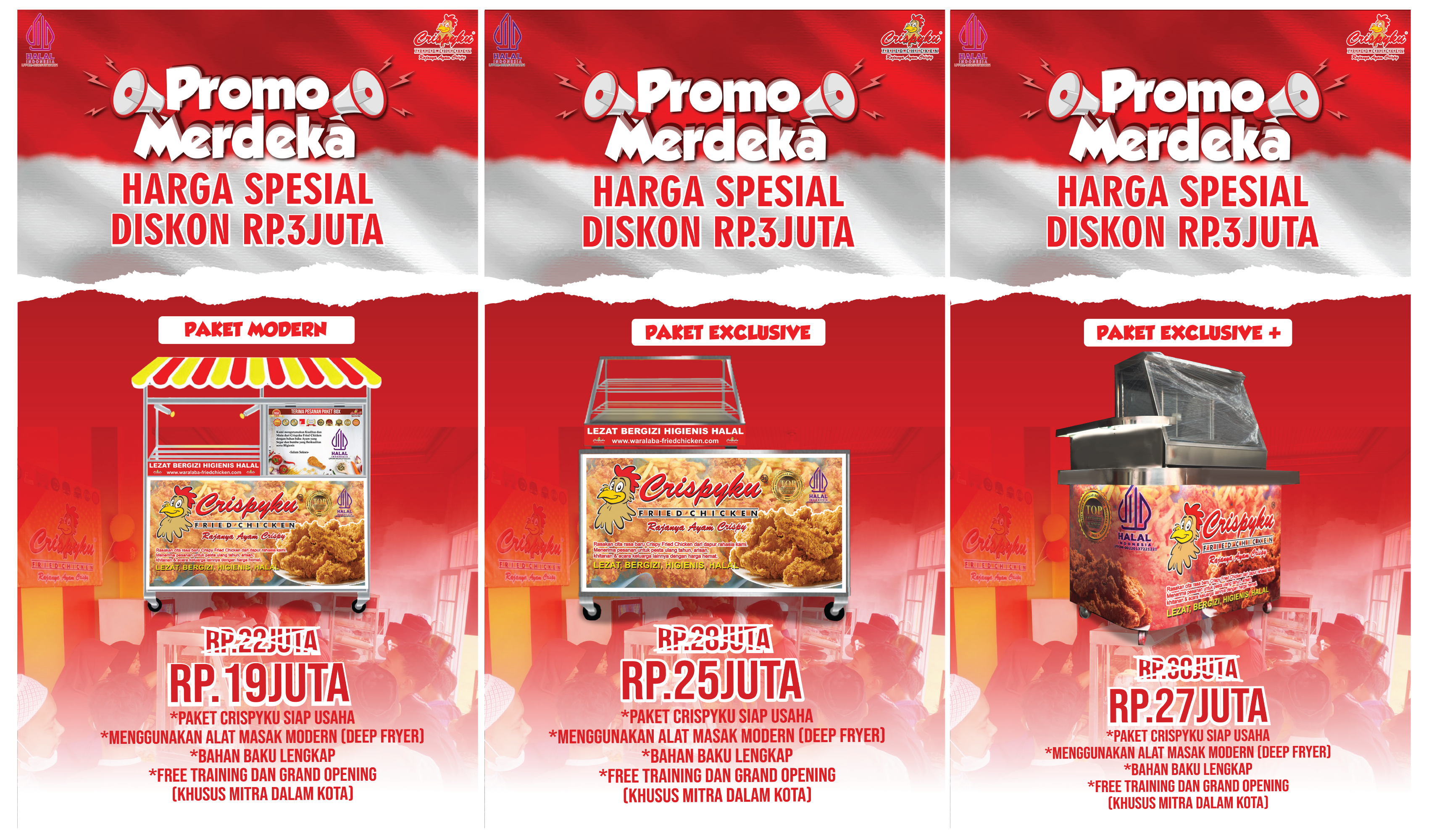 Di momen spesial ini memperingati hari kemerdekaan Indonesia 2024, Crispyku Fried Chicken memberikan tawaran luar biasa untuk memulai perjalanan bisnis kamu! Ayo raih kebebasan finansial dengan bergabung bersama kami dengan berbagai paket Franchise spesial Promo Merdeka. Kami mempersembahkan berbagai promo paket franchise dengan diskon fantastis yang dirancang khusus untuk memudahkan kamu memulai usaha lengkap dengan bahan baku dan alat masak.
